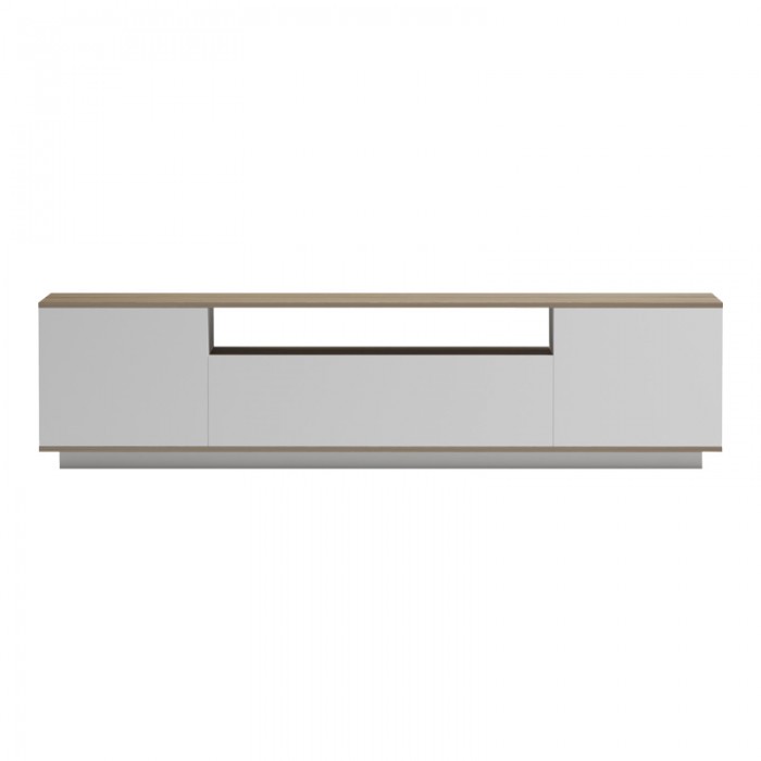 Αναβαθμίστε την ψυχαγωγική σας γωνιά με αυτό το σύγχρονο και ευέλικτο έπιπλο τηλεόρασης, σχεδιασμένο για να προσφέρει τόσο στυλ όσο και άφθονο αποθηκευτικό χώρο. Ο συνδυασμός του φωτεινού λευκού φινιρίσματος με τη ζεστή απόχρωση του ξύλου δημιουργεί μια αισθητική που ταιριάζει άψογα σε μοντέρνους και μινιμαλιστικούς χώρους.