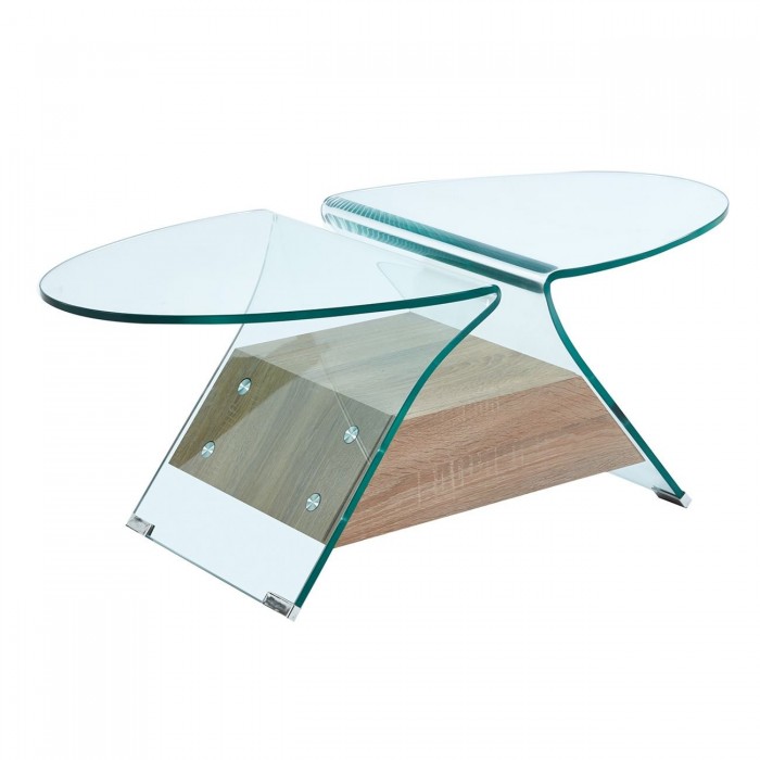GLASSER Wood Τραπεζάκι Σαλονιού Oval, Διάφανο Γυαλί 12mm, Ράφι Απόχρωση Δρυς 1τμχ
