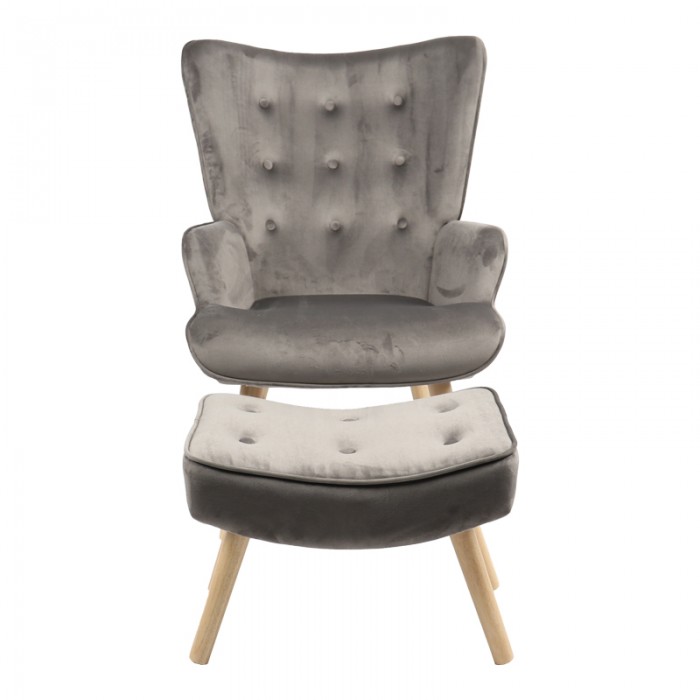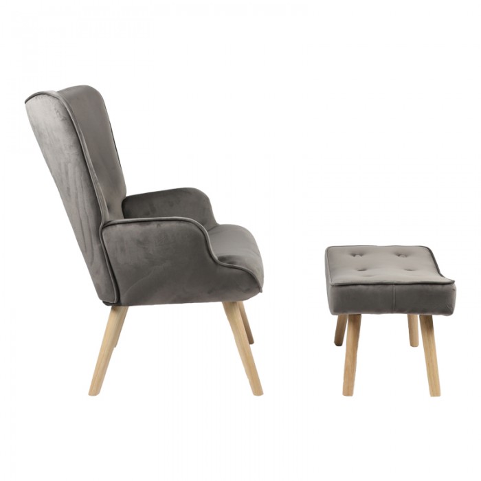 Πολυθρόνα με υποπόδιο Melisia pakoworld γκρι βελούδο και ξύλινο πόδι σε φυσική απόχρωση 59x67x94εκ