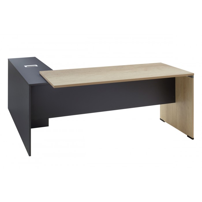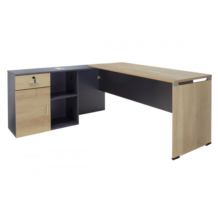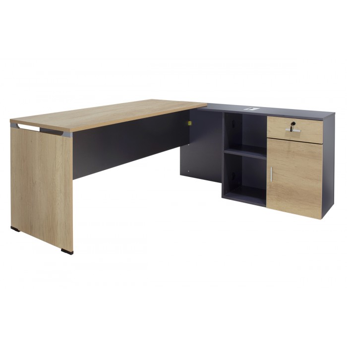 Γραφείο διεύθυνσης με ενσωματωμένο γωνιακό αναστρέψιμο ερμάριο στον εντυπωσιακό χρωματισμό: φυσικό - ανθρακί. Κατασκευασμένο από υλικά υψηλών προδιαγραφών και σύμφωνα με τις εργονομικές απαιτήσεις του σήμερα.