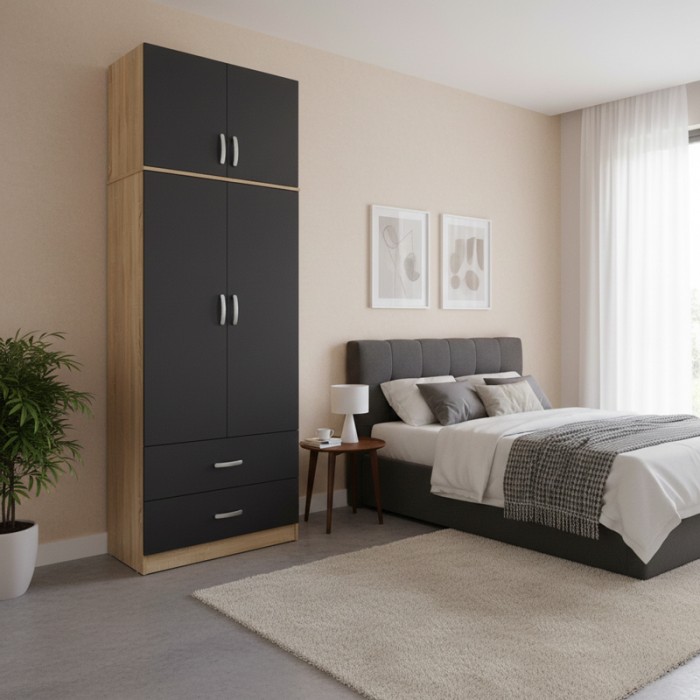 Ντουλάπα δίφυλλη με 2 συρτάρια και πατάρι Lego pakoworld σε oak-ανθρακί απόχρωση 80x42x240εκ