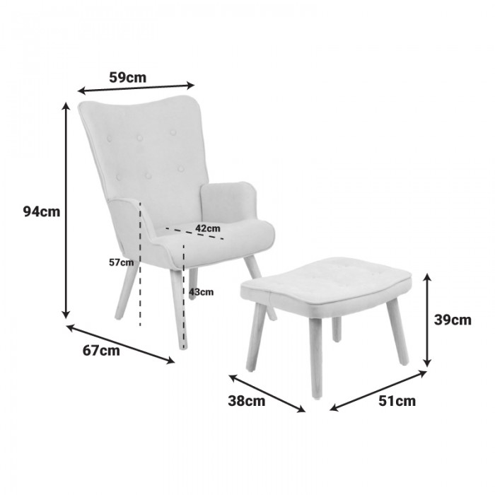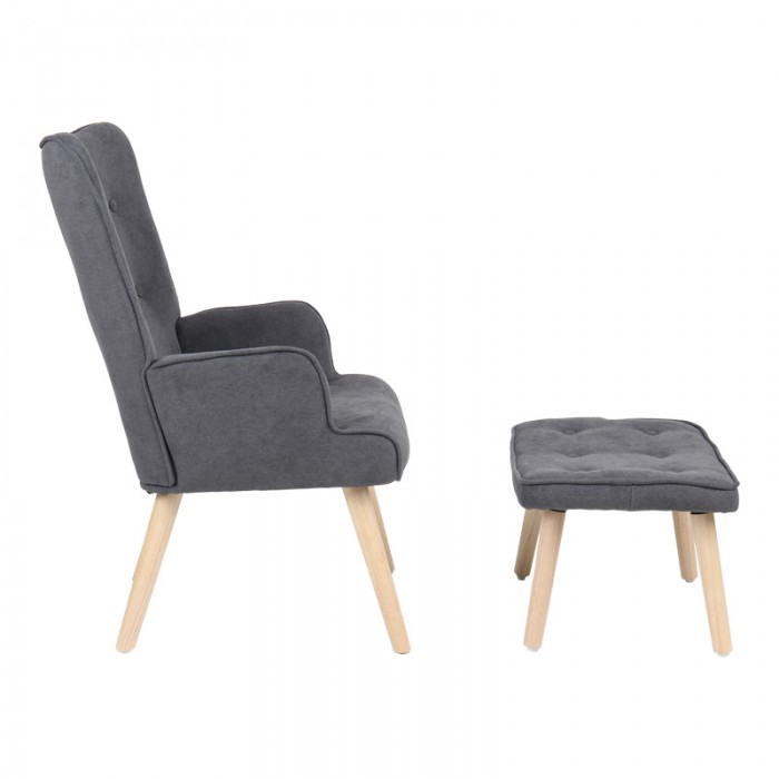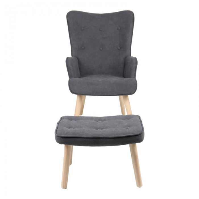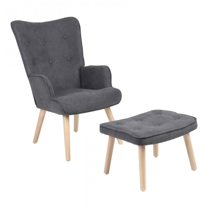 Πολυθρόνα με υποπόδιο Melisia pakoworld ανθρακί ύφασμα και ξύλινο πόδι σε φυσική απόχρωση 59x67x94εκ