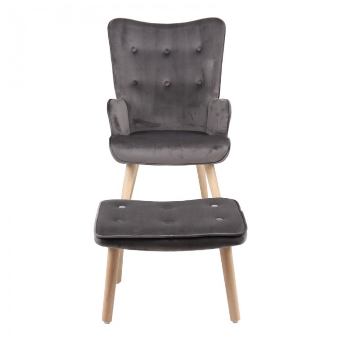 Πολυθρόνα με υποπόδιο Melisia pakoworld γκρι βελούδο και ξύλινο πόδι σε φυσική απόχρωση 59x67x94εκ